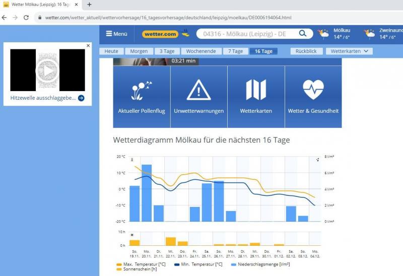 10 mm waren heute im Regenmesser, die gestern und in der Nacht herunterkamen. Somit summiert sich die Regenmenge im November bisher auf 60 mm, das ist viel zu viel. Seit ca. einer Stunde wird die Wolkendecke lückiger, es gibt größere blaue Stellen am Himmel, und die Sonne kommt heraus, aber es ist nach wie vor triefnass, auch wenn das Thermometer milde 11°C zeigt. Vielleicht trocknet es zum Nachmittag hin ein wenig ab, bevor morgen der nächste Regen angesagt ist. Die Eiskellertemperaturen für Anfang Dezember, die nun schon dreimal in der Vorhersage aufgetaucht sind, wurden wieder abgemildert, da ist also noch viel Bewegung in den Wettermodellen, die es immer noch kaum schaffen, mal zwei oder drei Tage richtig vorherzusagen.