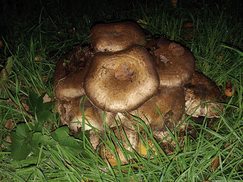 die wachsen in Büscheln, die Kappen werden 15 ... 20 cm groß (färben nicht bei Druck und Verletzungen, Lamellen sind braun) nächstes Jahr schleppe ich eine Stichprobe zur Pilzberatung: