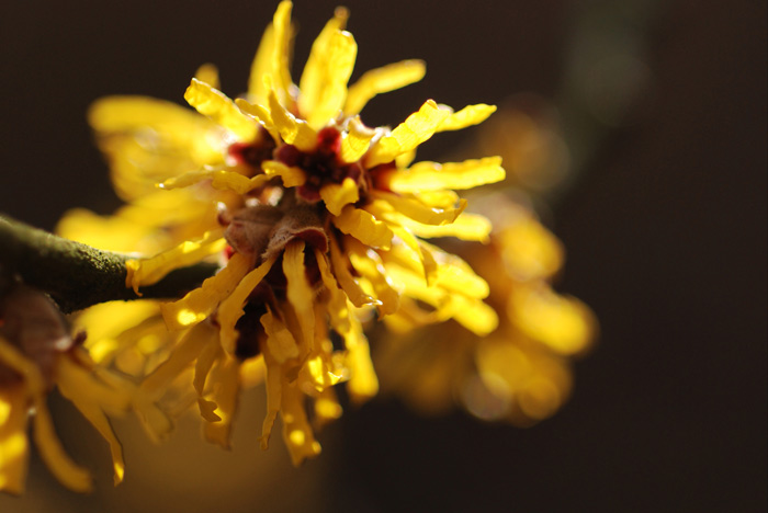 Hier ist heute ausgesprochenes Aprilwetter: Sturm, Regen, Graupelschauer und etwas Sonne, die die endlich beginnende Hamamelisblüte zum Leuchten brachte