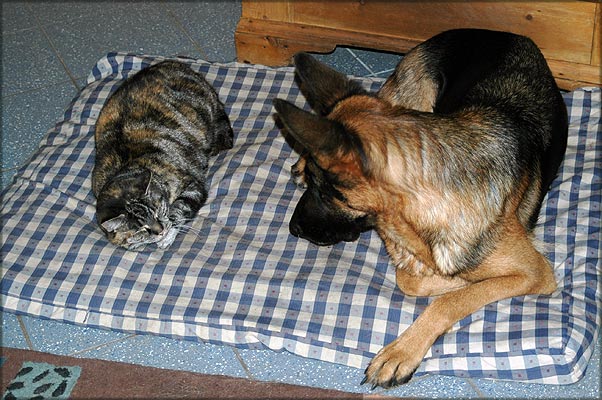 Diese Katze liebt Hunde, vorzugsweise Schäferhunde... ich habe immer ein wenig Angst um sie wegen ihrer "Verpolung"... sind schließlich nicht alle Schäferhunde so nett zu ihr wie unsere....Immerhin hat die Katze ihrer Freundin ja noch die Hälfte der Matte gelassen....Meine Hündin kann die Schmeicheleien der Katze kaum verstehen - das zu beobachten... unglaublich. Die Katze liebt die Hündin wirklich, schleicht ihr um die Beine, kuschelt sich an usw. - und die Hündin versteht die Welt nicht mehr.... Besonders glücklich sieht sie auf diesem Bild wenigstens nicht aus...