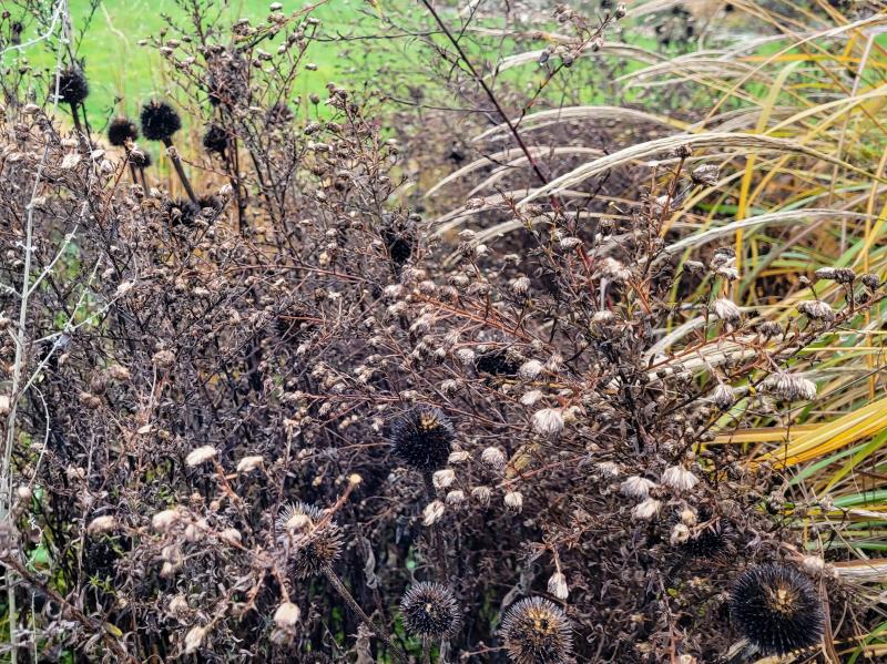 Gute Winteraspekte zum Schluß noch hier im Strauchbeet. Etwas düster vor dem Holzzaun, aber umso farbiger. :o