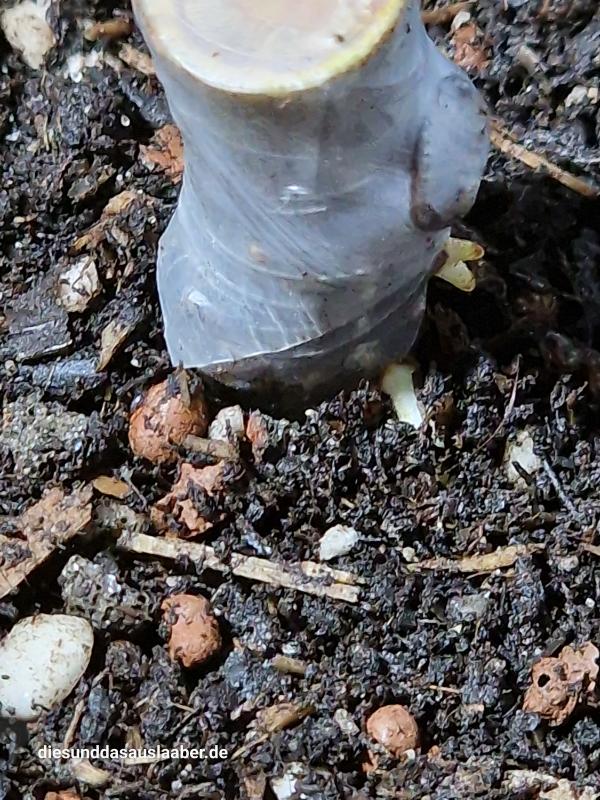 Ein Steckholz habe ich aber zusätzlich bekommen. Das habe ich ein paar Tage später geteilt und auf einer Wärmematte bei 22-23 Grad aufgestellt.