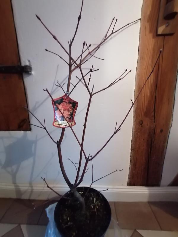 Meine Fächerahorne in Töpfen stehen den Winter über draußen auf der Terrasse, an die Hauswand gerückt und vor zu viel Regen geschützt. -12°C haben sie letztes Jahr (mit etwas Vlies umwickelt) problemlos weggesteckt. Als es vor zwei oder drei Jahren noch länger und noch etwas kälter war, hatte ich sie ins (ungeheizte) Gartenhaus gestellt, haben sie auch vertragen. Ich denke also mal, dass Deinem etwas Frost beim Versand auch nichts ausgemacht hat, er ist ja in Winterruhe. Das Schildchen auf Deinem Foto sieht übrigens genauso aus wie das an meinem neuen Acer palmatum 'Mikawa Yatsubusa', kommt vielleicht von der gleichen Baumschule. :)