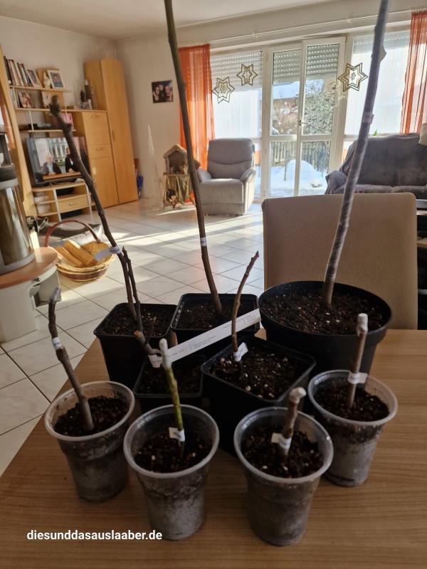 vorne - die hatten nur eine ganz kleine Wurzel - kommen im Haus auf die Wärmematte und werden durchkultiviert