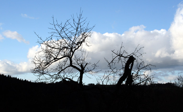 Sturmgeschädigte vor weiß/blauen bayrischem Himmel