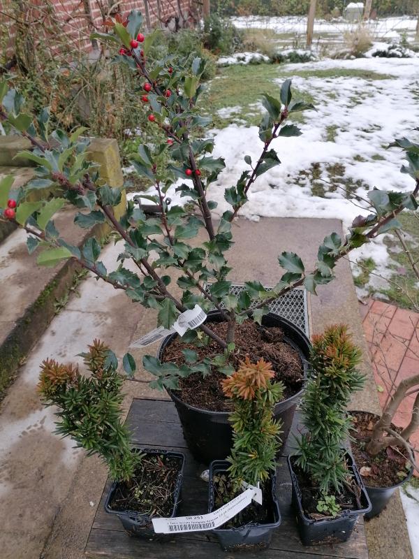 Dann noch Ilex meserveae 'Blue Princess', auch am oberen Ende der bestellten Skala (Dank an Hausgeist für die Inspiration noch einen Ilex zu setzen, wenn auch nicht-panaschiert). Sowie drei kleine Säuleneiben 'Robusta', die in Töpfen noch größer werden dürfen, bis ich zum Auspflanzen komme.