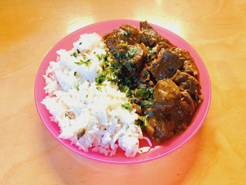 Zum Sonntag gab es Wildleberragout indischer Art mit Kardamom-Basmati. Heute die Rester.