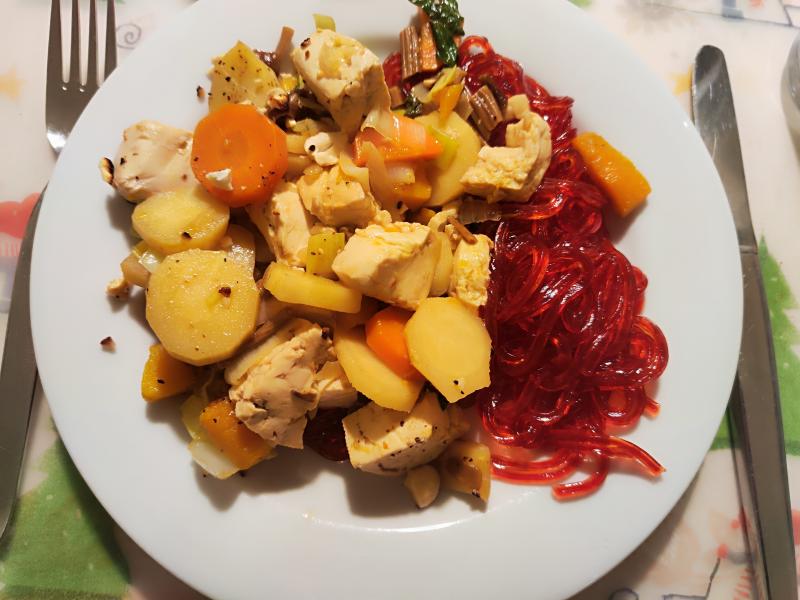 Heute ganz vegan Gemüsepfanne mit marinierten Tofuwürfeln und Nudeln auf Basis von Süßkartoffeln.