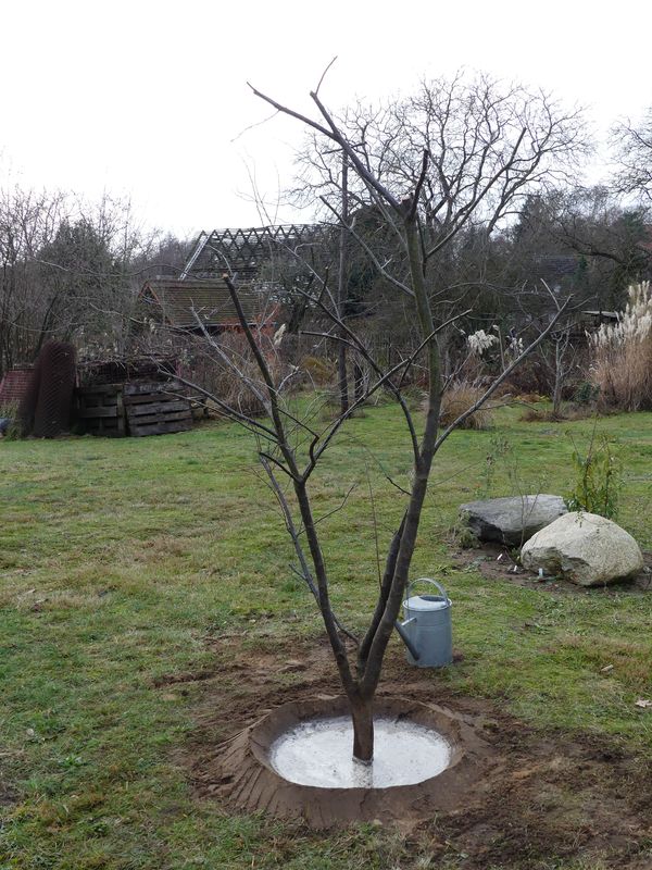 Diesen Winter müssen unbedingt noch ein paar Gehölze in den neuen Garten umgesetzt werden, bevor sie zu groß für's Verpflanzen sind. Bei einigen war es jetzt schon kritisch, aber alternativlos. Umgezogen sind heute Parrotia 'Felicie' mit bestimmt mehr als 3 m, eine Kirschpflaume, die auch schon um die 4 m hatte (der Sämling hier aus dem Garten, der grün austreibt und dann das Laub rot färbt), ein mehr als 2 m hoher Cercidiphyllum und der ebenfalls schon deutlich über 2 m große Acer 'Autumn Glory'. Für die Parrotia mussten drei noch kleinere Salix 'Yelverton' umziehen. Außerdem pflanzte ich noch Magnolia 'Paul Cook', die kürzlich mit ein paar weiteren Magnolien hier eingetrudelt ist. Alle bekamen ordentlich große Pflanzlöcher mit einer kräftigen Portion gut abgelagertem Kompost.