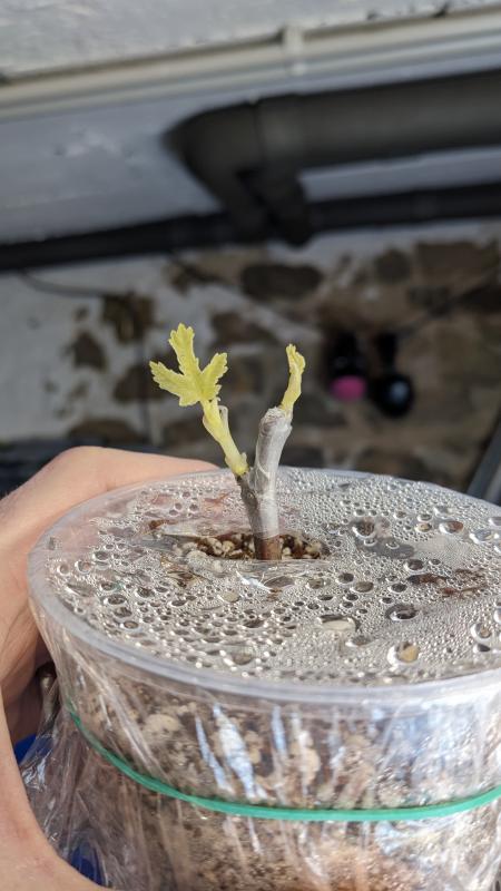 Ich habe nun doch eine Lichtquelle installiert, die für 12h brennt, nachdem sich nun das erste Blatt im dunklen Keller auf der Wärmematte gezeigt hat. Das dickere Stück Holz lässt sich aber mehr Zeit mit dem Austrieb als das dünne.