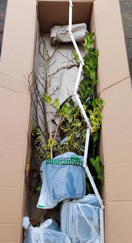 Heute kam eine Bestellung von Pflanzmich an, Blush hatte mit der Sycoparrotia 'Purple Haze' den Anstoß gegeben. ;) Auch bei mir kam die statt in 60/80 cm mit äußerst kräftigen 1,40 m. Restlaub ist im unteren Bereich noch vorhanden, daher keine Zweifel, dass es auch eine ist. Mitgereist sind zwei Ilex ('Blue Maid' und 'Golden van Tol'), beide sehen gut aus und sind am oberen Ende der Bestellgröße. Positiv überrascht bin ich von Betula 'Ruby Chocolate'. Als Größe war nur der Topf angegeben: 1 l. Da wäre ich nicht überrascht gewesen, wenn eine winzige Veredelung gekommen wäre, aber es ist ein kräftiges Exemplar mit 1,40 m.