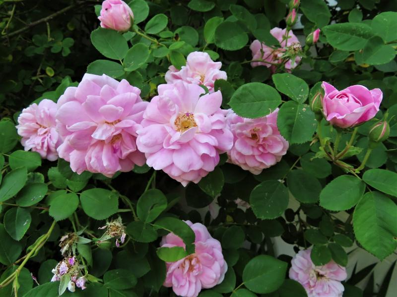 Eine der ersten Rosen, die ich hier gepflanzt habe, war der Zigeunerknabe (gezüchtet 1909). Die Beschreibung von Mercedes passt hier auch: Gesund, robust, winterhart, stachlig. Schönes Farbspiel von Werden zu Vergehen der Blüten.