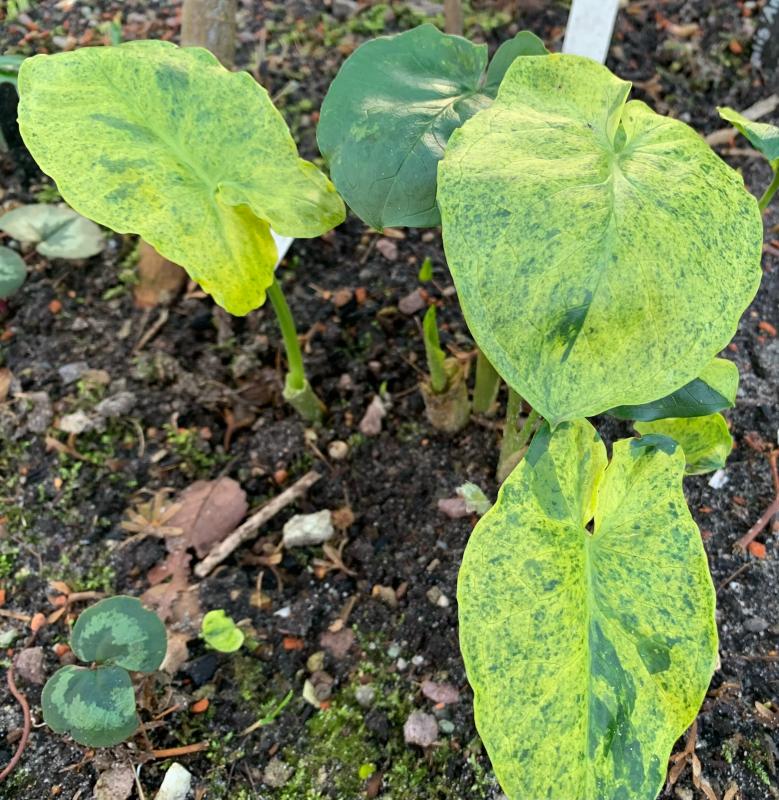 Durch den Schnee sind bei den großen Arum z.B. Hungarian Rapsody, Cris Tha Lihn, Amors Pfeil die Blattstiele abgeknickt. Die abgeknickten Stiele habe ich entfernt oder gestürzt, daher kein schöner Anblick.
