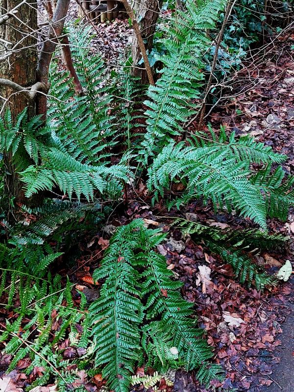 Auch die wintergrünen Schildfarne machen bei Schmuddelwetter eine gute Figur ( hier P. tsus-simense). Die Wurmfarne daneben sind aktuell nicht mehr