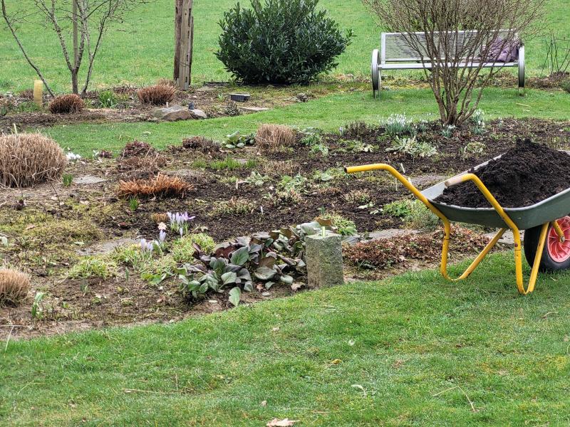 Die Wühlmäuse haben in diesem Winter im Präriebeet leider ganze Arbeit geleistet. Ich habe dem Beet erst einmal eine Lage Kompost verpasst, auch ein wenig zur Tarnung der Misere. :-X