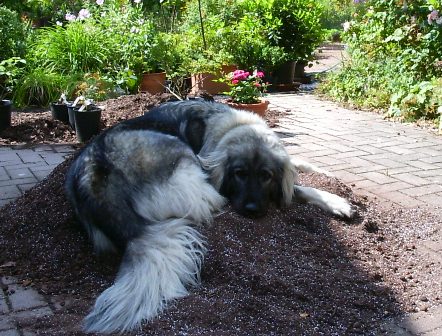 Nachdem ich oder der Rechner gestern zweimal abstürzten als ich mich hier vorstellen wollte, habe ich nun kurz entschlossen meine Vorstellung aus einem anderen Forum herkopiert - einige Mitglieder werden mich vielleicht kennen.Dass ich von Haus aus Gärtnerin bin, und das mit Leib und Seele, hab ich schon irgendwann geschrieben. Mein Ziel war, Gartenarchitektin zu werden, dann kamen diverse Allergien dazwischen und ich zog statt Pflanzen nur noch Kinder auf und zwar fünf. Der Älteste ist bereits über 40, der Jüngste grad Mitte 20, und zwei Töchter und den armen mittleren Sohn gibt es auch. Da witzigerweise mit jedem Kind ein wenig von den Allergien abgebaut wurde, fing ich wieder an, mich mehr mit Gärten zu beschäftigen. Vor knapp 13 Jahren sind wir nach Nordhessen gezogen, wo wir zu bleiben gedenken, nachdem wir über lange Jahre quer durch die Republik zigeunerten. Neben dem recht großen Haus war für uns alle der Garten besonders wichtig. Wir hatten das Glück, ein etwa 1 500 qm großes Grundstück mitten in der "Stadt" (5 000 Einwohner !) zu bekommen, das lange Jahre brach lag. Außer einer etwa 100-jährigen Eibe und ein paar alten Obstbäumen gab es nichts, was geschont oder gerettet werden musste. So konnten wir uns richtig austoben und viele unserer im Laufe der Jahre entstandenen Ideen und Vorlieben verwirklichen. Wie so oft, ist mein Mann auch bei uns der Mann fürs Grobe. der mit ungeheurer Akribie Wege anlegt und pflastert und all das verrichtet, wozu mir nicht mehr die Kraft reicht. Im Laufe der Jahrzehnte haben sich bei uns eine Menge Pflanzen angesammelt, die klaglos unsere Umzüge erduldeten, aber jetzt am endgültigen Standort so richtig zeigen, was in ihnen steckt. Nordseitig gibt es eine etwa 40 Meter lange Straßenfront, wo ich die Bepflanzung etwas bunter gehalten habe als im restlichen Teil. Die Menschen, die vorübergehen, freuts! Da wir uns gegen einen Rasen entschieden, gibt es nur mehrere große Beete ?, in denen als Sichtschutz hohe Sträucher und noch junge Bäume stehen, und drumherum wuselt es dann mit Stauden. Leider gehört meine Familie zur Gattung der Sammler, und das in allen Bereichen. So können wir von Glück reden, dass wir nicht nur ein großes Haus, sondern auch noch ein Nebengebäude haben, das nur das Gärtnerhäuschen genannt wird, und das im Winter die Kübelsammlung aufnimmt. Mein Mann "sammelt" Bäume und Sträucher und brauchte eigentlich ein Arboretum, um all seine Lieblinge unterzubringen(3 Catalpen, 2 Ginkgos, Amberbaum,3 Magnolien, Eisenholzbaum, Kiefern, Ahorne (in Hülle und Fülle) und 1 Tulpenbaum). Ich tu mich mit den Stauden schon leichter, es gibt immer wieder mal eine Lücke, die gefüllt werden kann. Außerdem konnten die ersten Füllsträucher gerodet werden, um nachwachsenden Gehölzen Platz zu machen. Meine Vorlieben haben sich im Laufe der Zeit geändert, z.T. hängt es mit den anderen Bodenverhältnissen zusammen, die Pflanzen müssen weitgehend mit dem kalkigen Lehm fertig werden. Nach wie vor gehören Pfingstrosen zu meinen Lieblingen, Astern, die frühen, duftenden Taglilienarten. Clematis zählen zu den Top- Favoriten, Rosen liebe ich sehr, werden aber reduziert, weil sie in unserem Dschungel offensichtlich nicht genug Platz und Luft haben. Gräser nehmen einen wichtigen Platz im Garten ein, und dann sind da die kleineren Pflanzen, die ich besonders liebe. Ob es Geranium sind oder Cyclamen, Reiherschnabel oder Hosta, sie sind mir genau so lieb wie Elfenblumen und Salbei. Der fehlende Rasen, der ja sonst zwischen den Farben vermittelt, wird durch die Bepflanzung ausgeglichen. Ich vermeide "Fleckerlteppiche" mit sehr vielen unterschiedlichen Pflanzen und Farben, und so ist mittlerweile ein "Gleiten" zwischen Struktur und Farbe entstanden, das in seiner Üppigkeit großzügig wirkt. Unser wichtigstes Familienmitglied ist Shara, ein Jugoslawischer Hirtenhund, unsere Dampfwalze. Ihretwegen mussten wir einen großen Teil des Gartens mit Elektrozaun absperren (steht fast nie unter Strom und wird trotzdem respektiert ), weil sie nicht nur ihre Kauknochen dort verbuddelt, wo die kleinen Schätze stehen, sondern mit Brachialgewalt alles vernichtet, was ihr im Weg ist. Momentan bin ich dabei, alles Empfindliche in den hinteren Gartenbereich umzusiedeln, damit die Hunde wieder mehr Platz bekommen. Und hier mein liebstes Photomotiv - Pflanzen hat hier jeder !