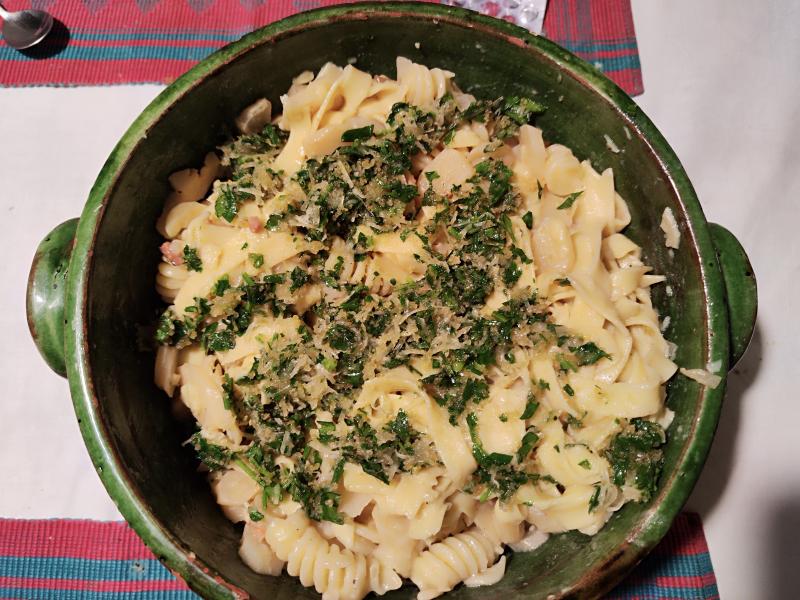 Pasta in Schwarzwurzelragout. Ich habe dieses Rezept nachgekocht. Weil ich noch etwas Muss-weg-Schinkenspeck hatte, habe ich diesen gewürfelt und mit der Butter am Anfang ausgelassen.