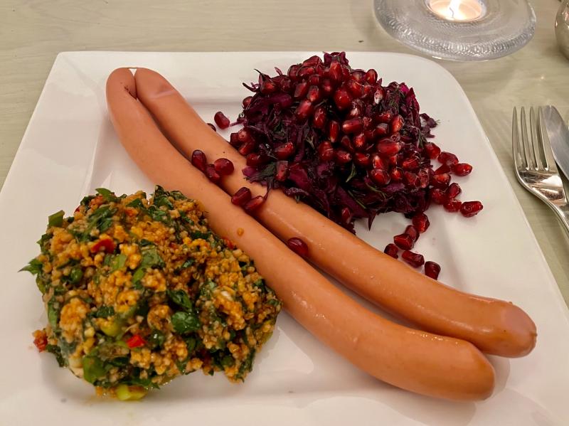 bei uns heute wiener sacherwürstel (bewusst kalt) mit selbstgemachtem tabbouleh und rotkohlsalat mit dill