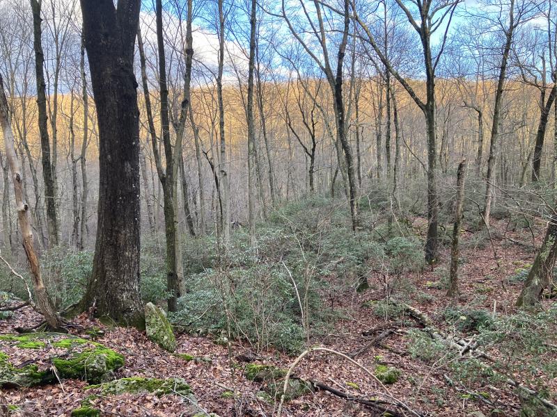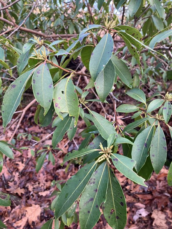 Vielleicht kann jemand diesen immergrünen Strauch einordnen? (Im Laubwald, Staat NY)