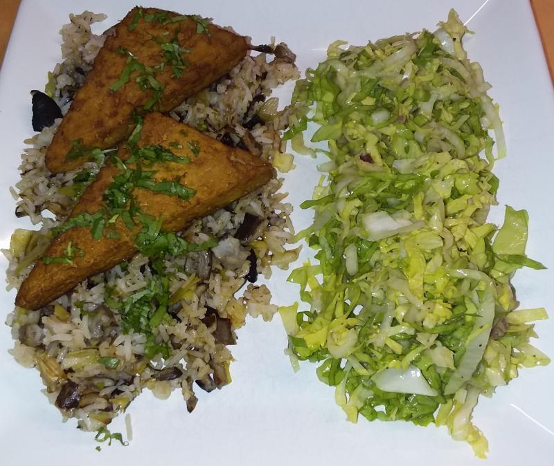 Gebratener Reis mit Porree und Pilzen, mariniertem Tofu und Endivien