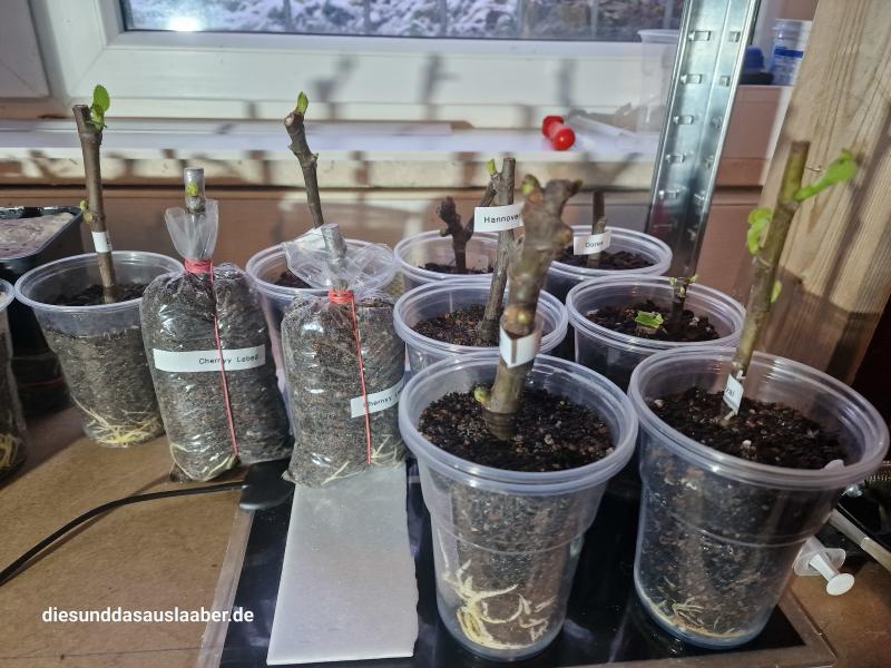 Hier ein Versuch, Black Madeira Stecklinge zu bewurzeln. Beginn war Mitte November 2023. Zwei Stecklingen haben mittlerweile ausgetrieben. Bei den beiden anderen tut sich nichts. Der Steckling ganz links im Bild kommt mittlerweile problemlos ohne Plastikabdeckung zurecht und wächst weiter; er hat offensichtlich bereits Wurzeln gebildet.