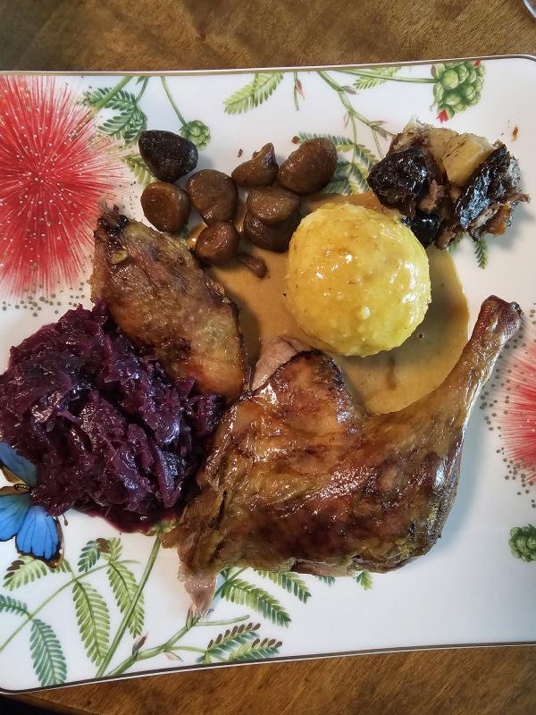 Hier wurde die Ente sehr gelobt, das traditionelle Familienrezept ergibt auch eine zartsaftige und knusprige Ente. Nur muss man dann am gleichen Tag viele Stunden in der Küche stehen. Aber einmal im Jahr mache ich das, meditativ und mit Freude. Dazu gabs Kartoffelklöße, Füllung mit Croutons, Backpflaumen, Quitten und Hackfleisch, geröstete Maronen, Rotkohl und natürlich die cremige Orangensoße. Ich habe diesmal ein ganz tolles Rotkohlrezept für den Druckkochtopf ausprobiert, das wird abgespeichert!
