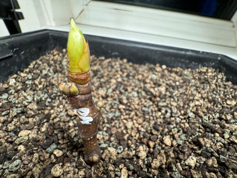 Hier ein Versuch, Black Madeira Stecklinge zu bewurzeln. Beginn war Mitte November 2023. Zwei Stecklingen haben mittlerweile ausgetrieben. Bei den beiden anderen tut sich nichts. Der Steckling ganz links im Bild kommt mittlerweile problemlos ohne Plastikabdeckung zurecht und wächst weiter; er hat offensichtlich bereits Wurzeln gebildet.