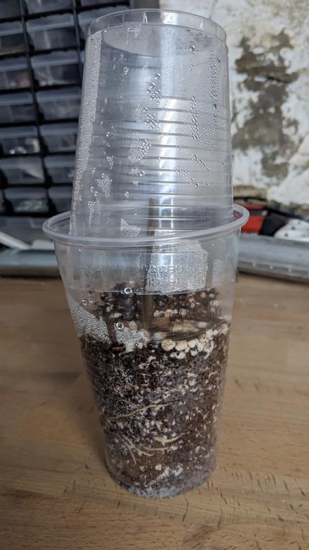Ich hatte ein Steckholz gekauft was in vermeintlich schlechtem Zustand ankam. Sehr dünnes Steckholz mit Terminalknospe wovon die obere Hälfte schon halb vertrocknet und eingefallen aussah. Sehr ärgerlich. Habe es halbiert und den unteren Teil des Holzes in Kokos/Perlit gesteckt. Da ich öfters gelesen habe, dass Hölzer in schlechtem Zustand oder kleine Hölzer unter gespannter Luft noch zu retten sind, habe ich es ausprobiert. Und ich muss sagen es läuft bisher ziemlich gut mit der Becher-auf-Becher-Methode ;D
