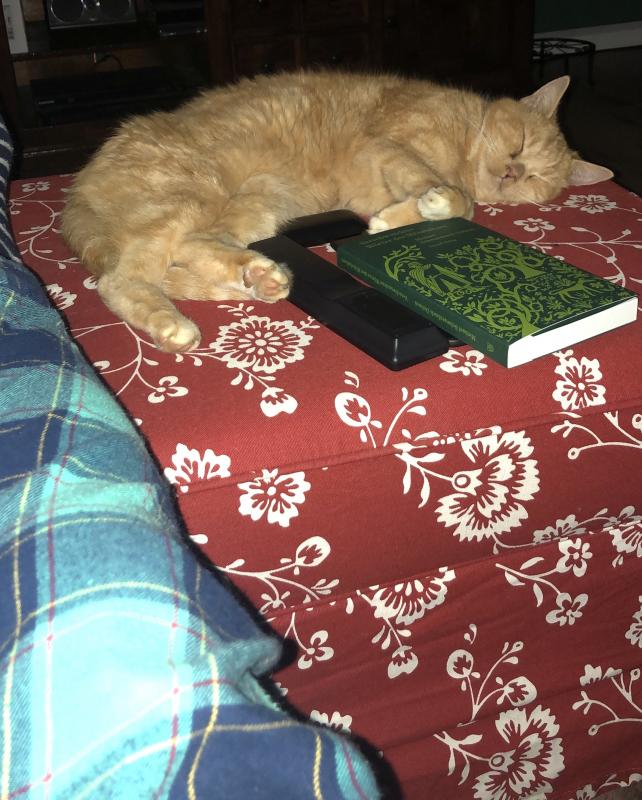 Glücklicherweise hat er jetzt den Platz auf der Wolldecke auf meinem Schoß entdeckt, wenn ich mich gemütlich in den Sessel setze. Bisher ist Kalle das nicht so geheuer. Jetzt teile ich mich halt auf ...