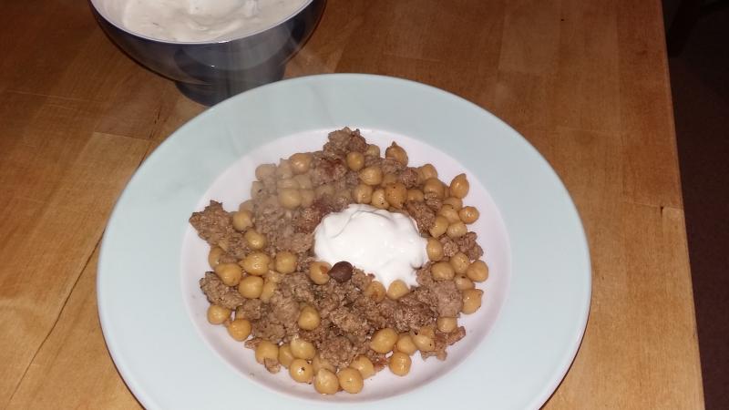 Hier gab es gestern einen Hähnchenschenkel aus dem Ofen, Lauchgemüse mit roten Linsen und dazu Roggenbrot. Heute eine Hack-Kichererbsenpfanne (Baharat), einen gr Joghurt (Knoblauch, Zitrone und Kreuzkümmel) und (gekauftes) Naan-Brot.