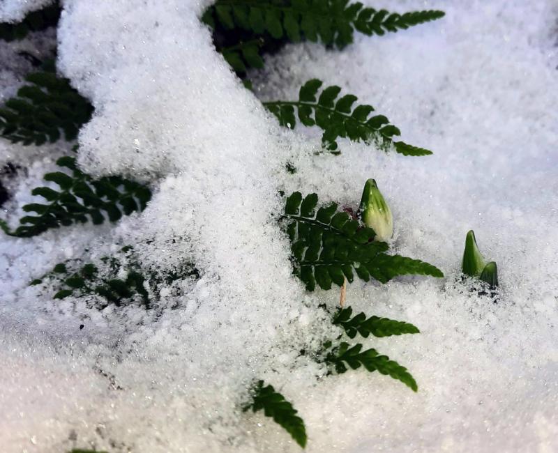 Mir ist etwas Schnee momentan lieber als der gemeldete Barfrost in den kommenden Nächten. Galanthus 'Sprite' bildet im Februar einen schönen Tuff neben dem Farn und ist zum Glück noch gut geschützt unter dem Laub. Einige andere Sorten, die wesentlich weiter ausgetrieben sind und schon Blütenansatz zeigen, werden dann leider bei bis zu 9° minus tapfer aushalten müssen.