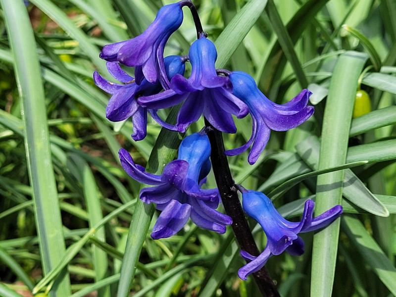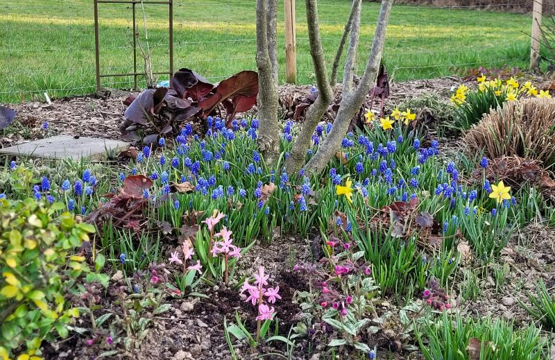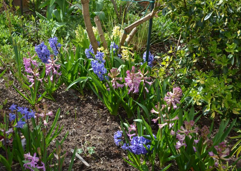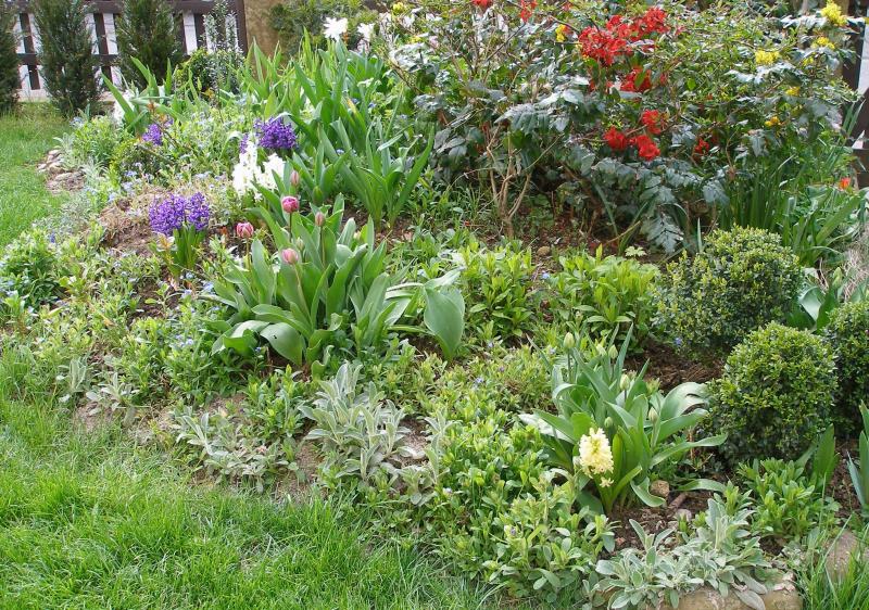 ...aus den " bunten" Gartenanfangszeiten: Frühlingsbeet mit Hyacinthen, Mahonie, Zierquitte, Tulpe, Vergissmeinnicht....