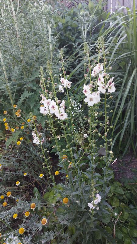 Hier säht sich die weiße Königskerze seit Jahren zuverlässig aus. Die rübenartige Wurzel wird allerdings auch gerne von Mäusen gefressen. Der Blatthorst liegt dann wie Kopfsalat auf dem Boden. Fasst man sie an, hat man sie einfach in der Hand. :-X Deshalb lasse ich viele stehen und pflanze bei Bedarf kleine Sämlinge im Frühjahr an die passende Stelle. Das funktioniert auch ganz gut. Diese Verbascum im vorderen Präriebeet haben sich ihren Platz allerdings selber ausgesucht. ;D .