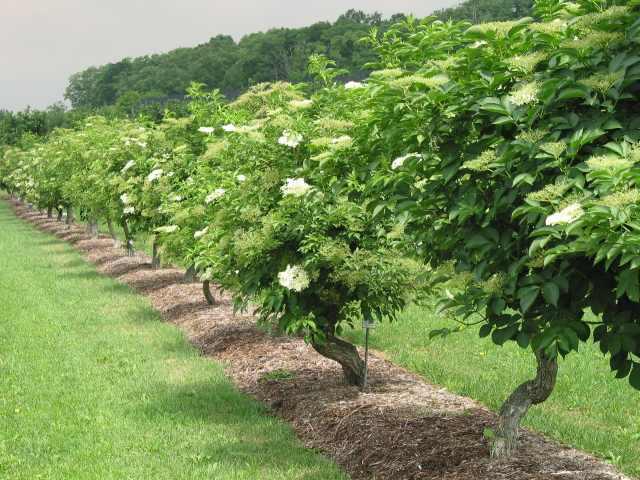 Und hier eine Holunder-Reihe mit grünem Laub. Man beachte die dicke Mulchschicht, die sich so unter allen Gehölzreihen dort findet.