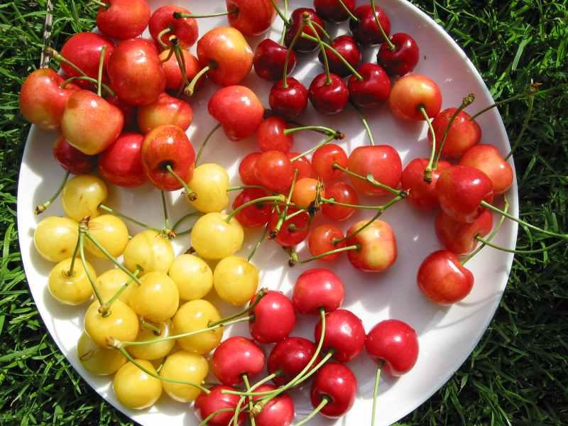 Die Kirschen sind, von 12 Uhr beginnend (dunkelrot): Vlachuv Semenae, 41/15, Pi-Na 19, Pi-Na 599, Gil Peck, Ludwigs Frühe.Es gab noch sooo viel mehr, aber ich war auf einen 'richtigen' Kirschenvergleich nicht vorbereitet. Die eher unansehnliche gelbe schmeckte übrigens recht gut, die schöne dunkelrote eher nicht. Aber möglicherweise lag das daran, daß es für Vlachuv noch eine Woche zu früh war, während die gelbe eindeutig ihren normalen Erntetermin schon überschritten hatte.Ludwigs Frühe (in der Mitte) ist keine Süßkirsche.