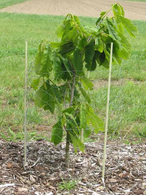 Auch die Holunder waren alle als kleine Bäumchen erzogen. Außer einigen 'normalen' Sorten gab es auch zwei oder drei mit dunkelrotem Laub.Meine besonderen Objekte der Begierde: Pawpaw, Asimina triloba. Die Pflanzung ist noch sehr neu, daher waren weder Blüten noch Fruchtansätze zu bestaunen. Der Prüfstellenleiter (?) und ich hatten gleich eine kleine 'Meinungsverschiedenheit': Er erklärte, daß 'Sunflower' nicht selbstfertil sei. Ich hatte bisher überall das Gegenteil gelesen aber seine Literatur nennt nur 'Prima 1216' als selbstfertil. Wir werden sehen...
