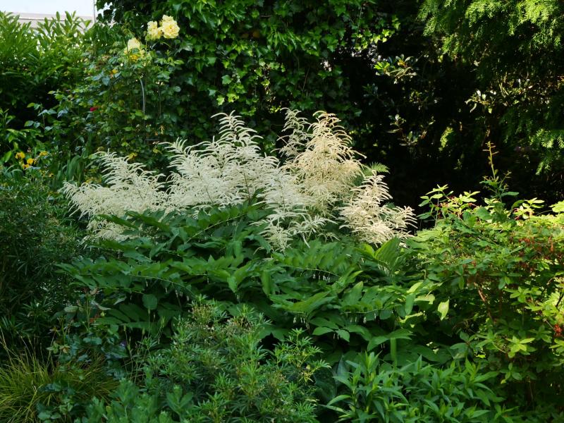 Aruncus 'Zweiweltenkind' mit Rose,Polygonatum, Choysia etc