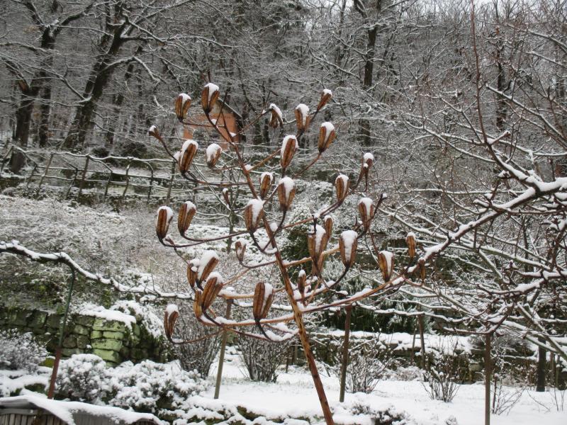 Auch die Samenstände der riesigen Lilien, deutlich über Kopfhöhe, wirken mit Schnee recht dekorativ.