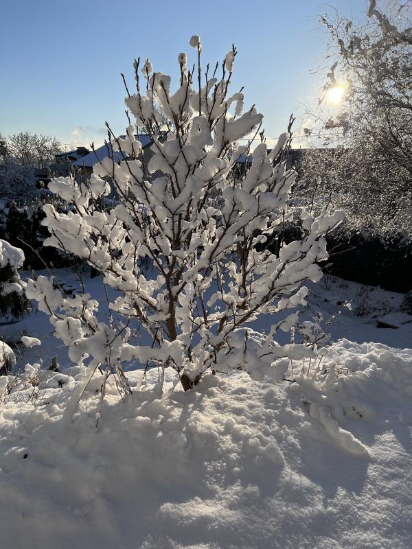 Sonne im Winter, das ist leider wirklich selten... Hier kam selbige mal für eine Stunde zwischen den Wolken hervor, und da es heute Morgen ordentlich geschneit hat (ca. 5 cm, viel für unsere Verhältnisse), sah das Ganze wirklich wunderbar aus. Also habe ich mir - Homeoffice sei Dank - nach dem Mittagessen die Kamera geschnappt und habe ein paar Fotos vom "tief" verschneiten Garten gemacht. Vor allem die Sträucher bogen sich unter der Last des zu Eis gefrorenen Regens, der gestern den ganzen Nachmittag bis tief in die Nacht hinein gefallen ist. Zusammen mit dem Schnee sah das dann noch viel hübscher aus. :)