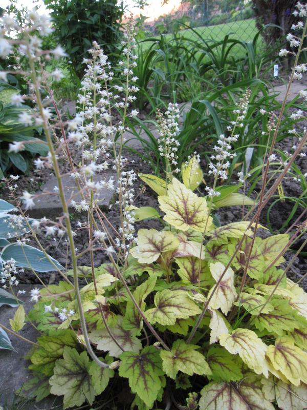 Jetzt mache ich weiter mit Heuchera 'Stoplight' und Taglilien- und Hostablättern.