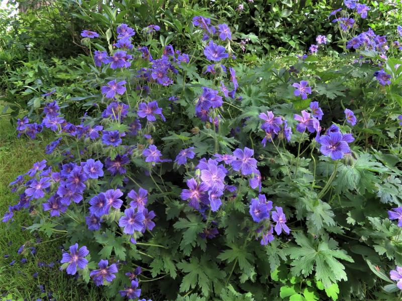 Da ist auch Geranium dabei, dazu Rambler, Zwetschkenbaum und Lorbeerkirsche.