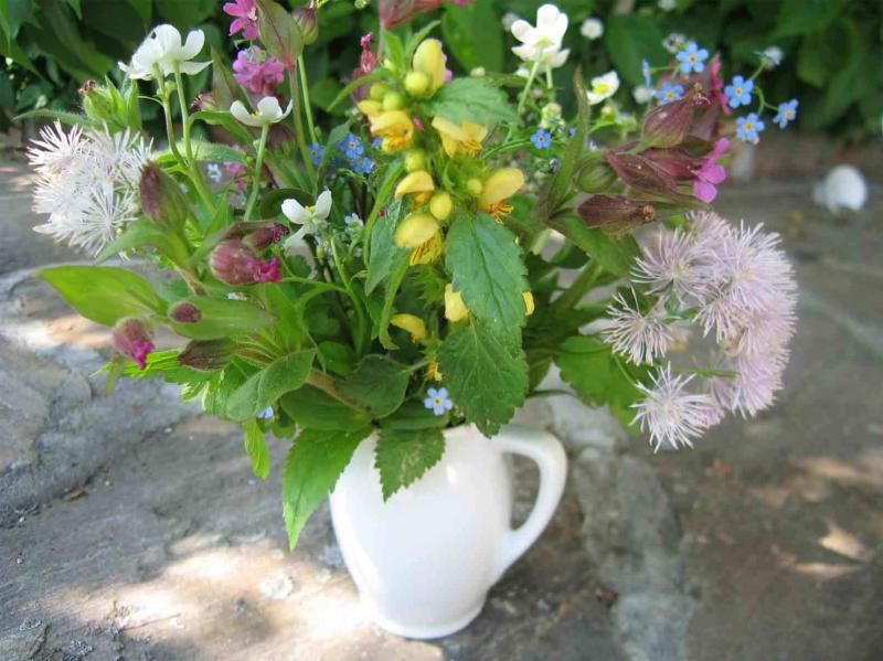 :D Wunderbar wildfröhlicher Strauß in einer schönen Vase auf einer perfekt verwitterten Bank ...
