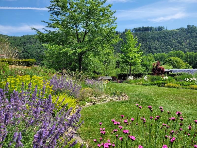 Die Wildkirsche im Sommer, davor das Steppenbeet mit reichlich zum Anlegen. ;)
