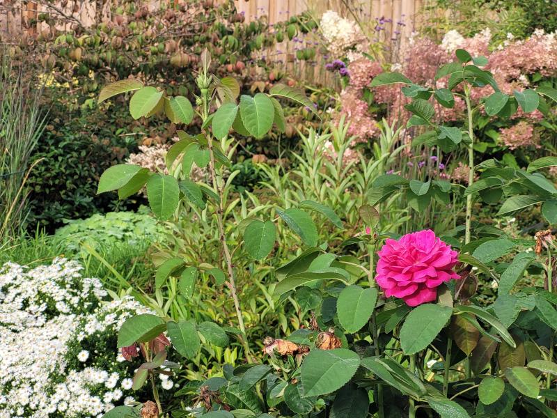Prunus persica etc. mit Felsenbirne, dazu links Hochbeet mit Heidelbeeren und Kletterrose, rechts Komposter.