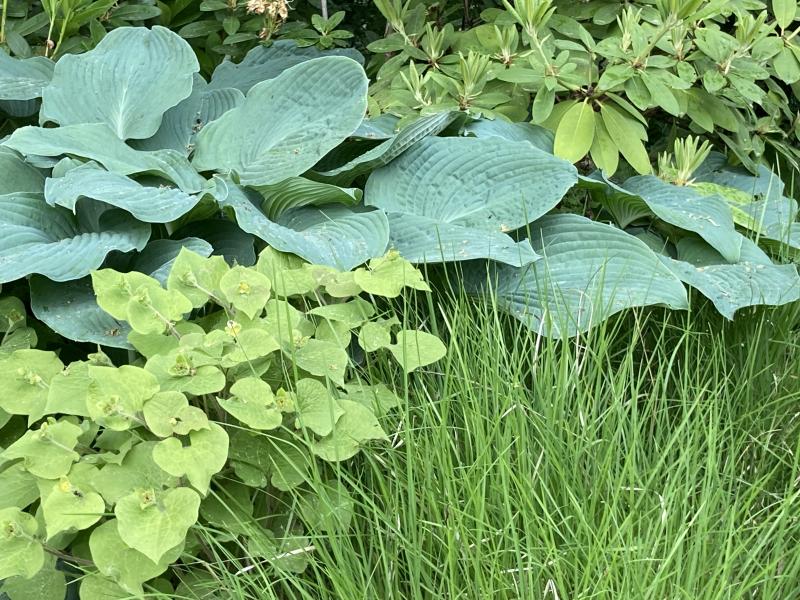 Nochmal Hosta mit Glockenblumen, Albizzia, kleiner Feige, Dregea (rechts in der Ecke)...