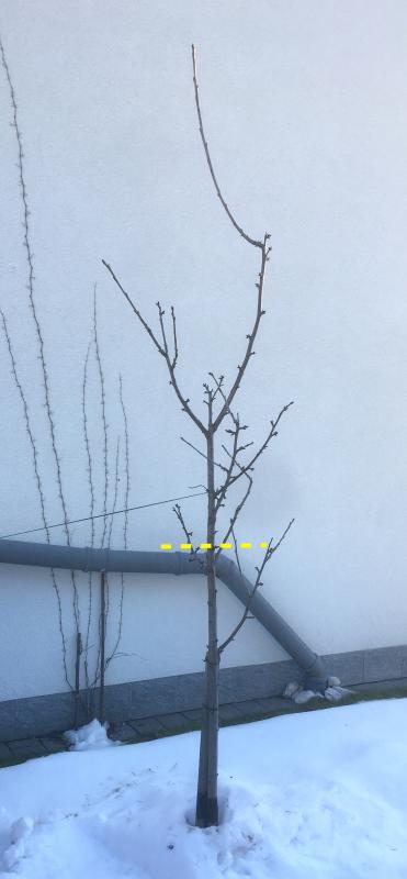 Ich möchte meine viereinhalbjährige Kirsche Kordia zu einer Hohlkrone umerziehen. Ist das jetzt noch möglich? Sie ist schon 3,5 Meter hoch. Ich würde den Schnitt an der gelben Markierung ansetzen, auf etwa 1,20m. Kann man das so noch machen? Wann wäre dafür der beste Zeitpunkt und was sollte ich dabei beachten?