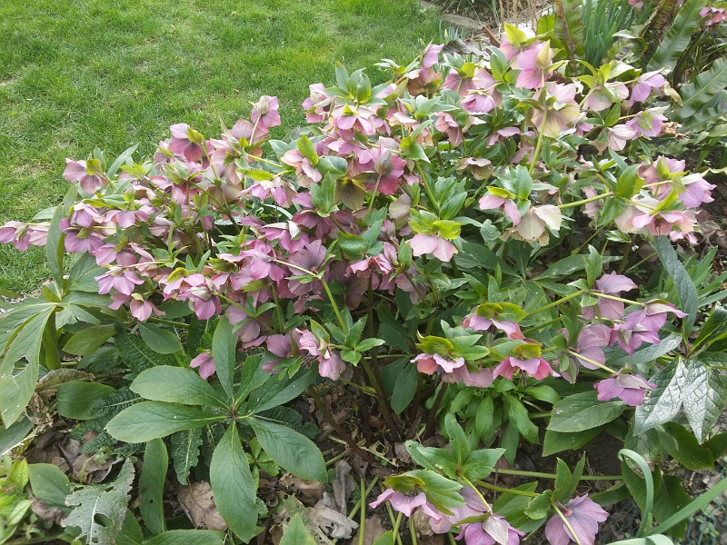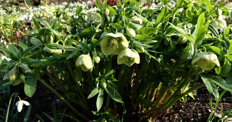Vor Jahren habe ich die Grüne Nieswurz (Helleborus viridis) ausgesät. Sie blüht typischerweise mit kleineren grünen Blüten und kahlen Stängeln und verliert im Winter ihr Laub. Zwei Pflanzen stehen zwischen verschiedenen Lenzrosen, deren Laub ich im Frühling entferne.