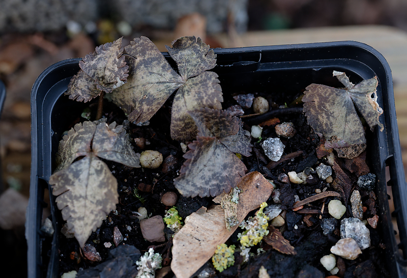 Anemone keiskeana hat den Winter im Topf gut überlebt, und hat jetzt schon tolles Laub.