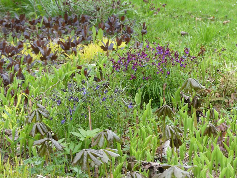 Ich finde, Lathyrus vernus ist sehr gut verträglich mit frühen Geophyten - einerseits zieht die Frühlingsplatterbse ja vollkommen ein im Herbst, es bleiben nur drahtige dünne Stängel stehen, und andererseits hab ich den Eindruck, dass auch der Neuaustrieb im Frühjahr länger „filigran“ bleibt, bis alles Laub voll entwickelt ist.