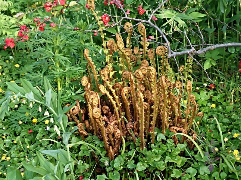 Farn treibt auffällig aus mit viel Drumrum
